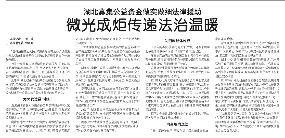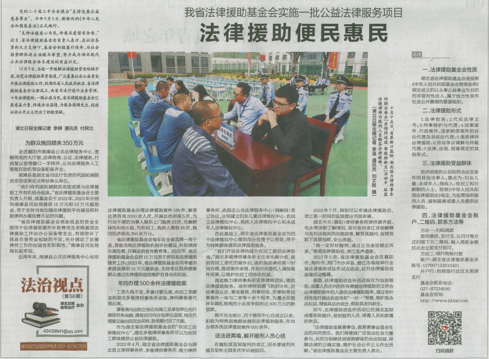 编者按:2024年12月4日、2024年12月10日,《法治日报》、《湖北日报》分别报道了我会开展法律援助工作的几点做法的文章,现予以转发。